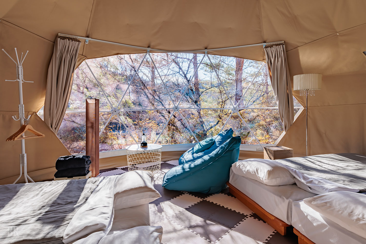 スイスアルプスの山岳リゾートで採用されている直径6mの大空間を誇るドームテントは、寒冷差の大きい長野の自然環境にも適応可能です。